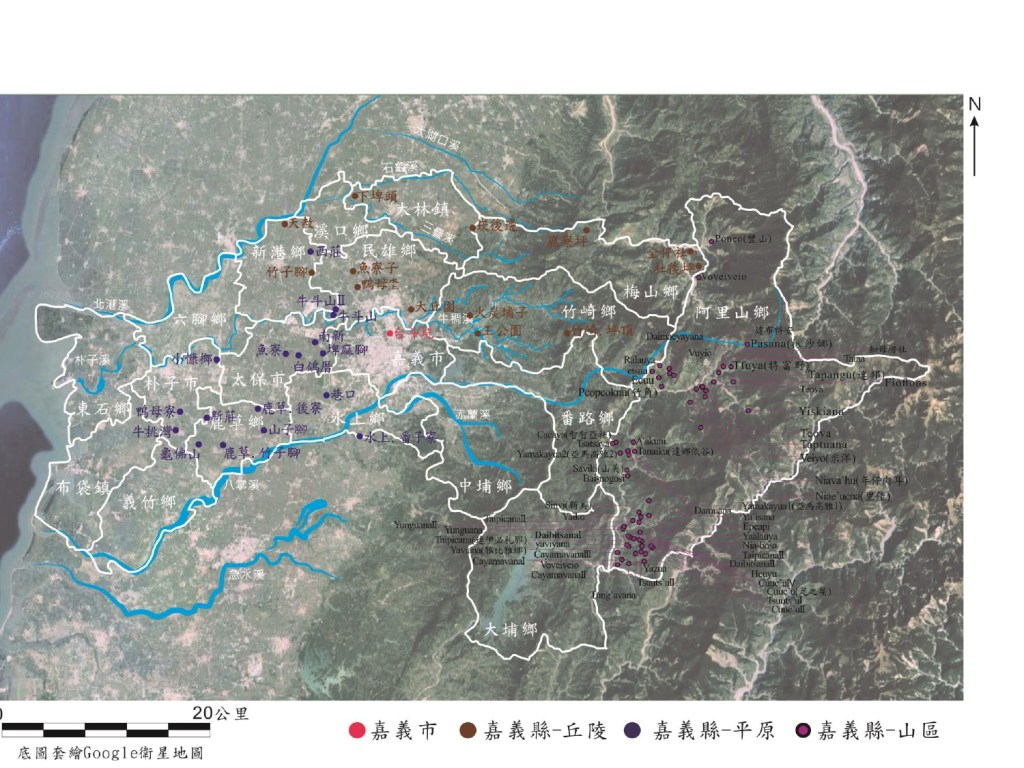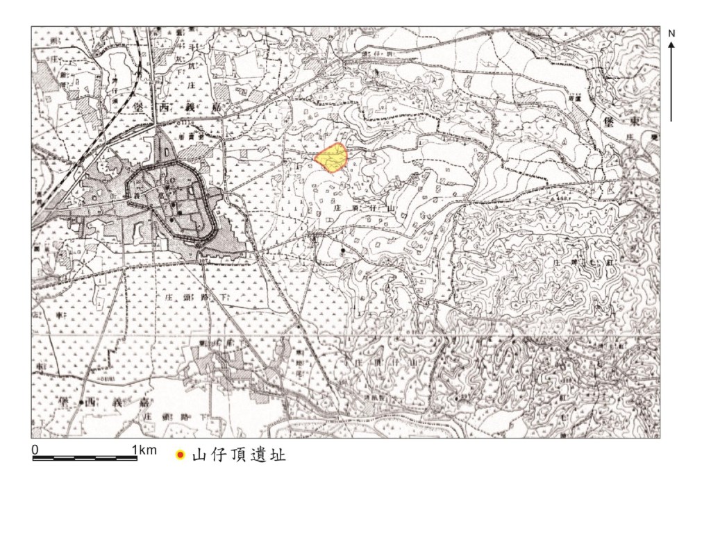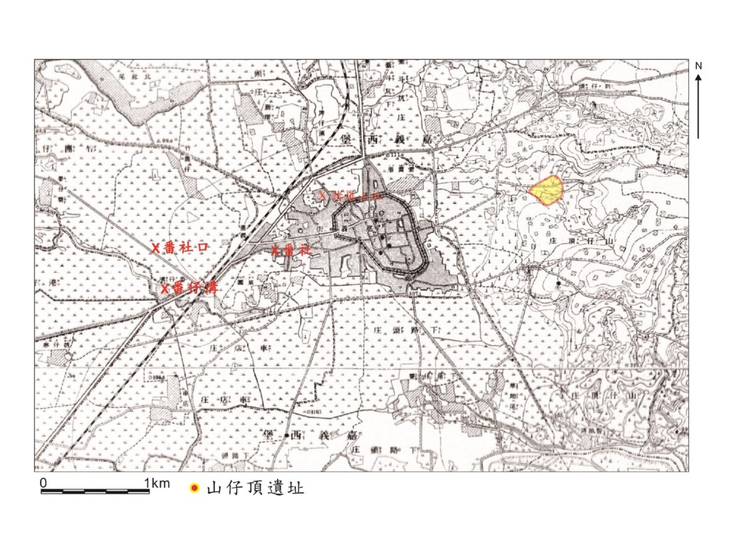 那麼,對於這樣第一個可能與「諸羅山社」相關的考古遺址之命名,若以該遺址所在地套繪1904年《臺灣堡圖》,則可知當地的小地名為「番仔溝」。但由於以「番仔溝遺址」作為命名者,早在西元2000年陳南榮老師於雲林縣斗六市調查發現、2005年劉益昌教授進行試掘研究後,即被搶得了考古遺址命名的先機。因此,筆者初期再以更早階段,日治初期明治28年(1895)《嘉義之戰鬥圖》上的小地名「番仔交庄」,作為本考古遺址的命名。一方面也記錄日本人對於這個聚落最初的地名記載,另一方面也維持考古遺址的獨立性名稱。其實,就閩南語發音而言,不論是「番仔溝」或是「番仔交」,都指涉同一個意義,即位於小溪溝邊的原住民聚落,但是「番仔交」是否具有另一層原住民聚落「邊界」的意涵,則不得而知,因此當時對於該考古遺址的命名,也因認為這個聚落名稱更具有未來研究的啟發性,因此才決定捨棄需淪為「老二命名原則」的「嘉義•番仔溝遺址」,而改以「番仔交庄遺址」作為命名。
